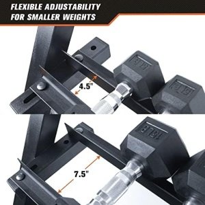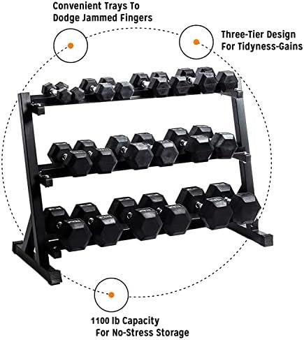 ✎[Space-saving design]:Gives you a same utility of a 2-tier dumbbell rack with a much smaller footprint while not compromising the storage capacity. The 3x 1.2m trays space for more number of dumbbells than the standard 2-tier designs.