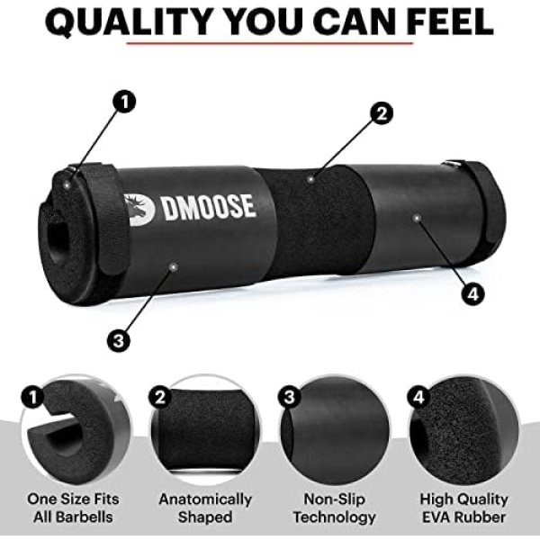 NON SLIP TECHNOLOGY – The easy-slide design of the DMoose Squat Pad with its non-slip technology eliminates any need for straps. Non-Slip Technology provides maximum security and holds the Bar Pad in position.