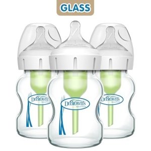 Dr. Brown’s Natural Flow Anti-Colic Options+ Wide-Neck Glass Baby Bottle 5 oz/150 mL, with Level 1 Slow Flow Nipple, 3 Pack, 0m+