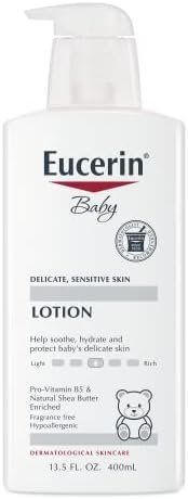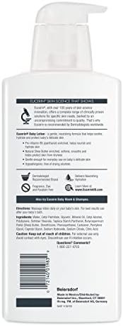 Eucerin Baby Lotion moisturizes and nourishes baby’s delicate skin, helping to leave it soft, smooth and protected. This hypoallergenic baby lotion formula is gentle enough to use every day and is enriched with soothing ingredients like Pro-Vitamin B5 and natural Shea Butter. Eucerin unscented baby lotion sensitive skin formula is free of fragrances, parabens, dyes and drying alcohols. To use, massage Eucerin Baby moisturizing lotion daily on your baby’s skin. For best results, use after your baby’s bath. Eucerin Baby skin care products feature gentle formulas for baby’s skin. Pair this dry skin baby lotion with Eucerin Baby Wash and Shampoo as part of your baby skincare regimen. Eucerin is a dermatologist and pediatrician recommended skin care brand that is based on an uncompromising approach to science.
