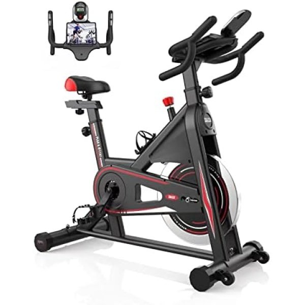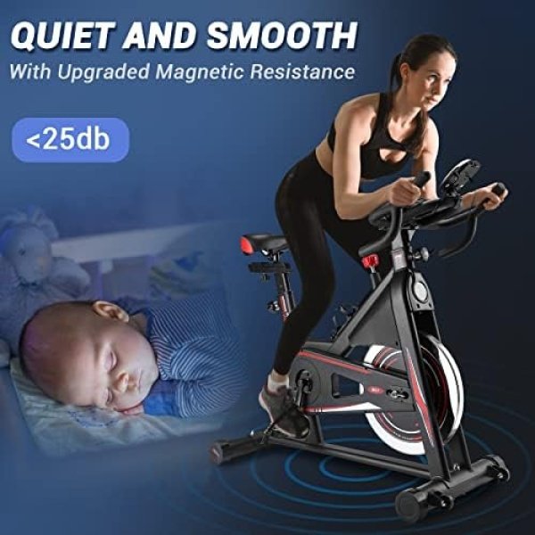 【Silent and Smooth】This indoor cycling bike’s magnetic resistance system is upgraded to 6 magnets, with wider adjustment range, the difference from minimum to maximum resistance is equivalent to flat to mountain riding experience.