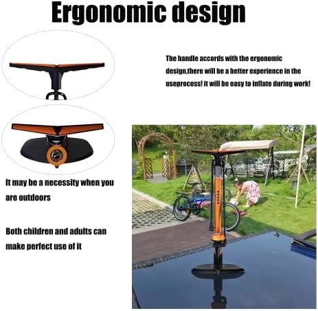 Ergonomic design-Egromically designed comfortable handle,Floor pump with easy to read gauge,Max 174 PSI / 12 Bar high pressure capacity, accurate air pressure can be displayed when inflated, making it easier to visually see and fit easily into the proper pressure prevents accidental tire blowouts