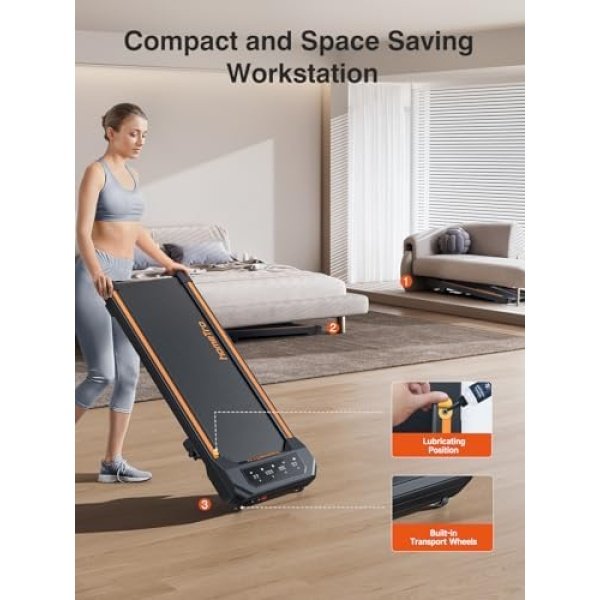 🏃‍♀️ 【EASY TO MOVE AND STORE】Compact, portable and solid design, no assembly required, ready to use out of the box. This compact lightweight treadmill with transportation wheels make it easy to move and store on the corner or under the sofa or bed, so very suitable for small-space apartments and office.