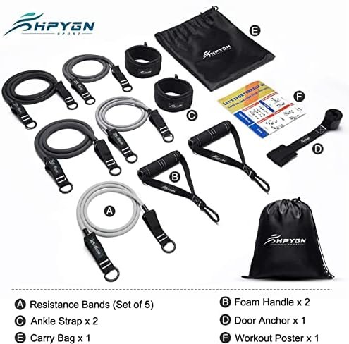 💪【Heavy Resistance Band Set】HPYGN resistance bands come with 5 different resistance level 10lbs, 20lbs, 30lbs, 40lbs and 50lbs in 5 different colors. You can use the bands independently or in any combination with a maximum resistance level of 150lbs.It comes with 5 latex resistance bands, 2 hand grips, 2 ankle straps, 1 door anchor, a carry bag.