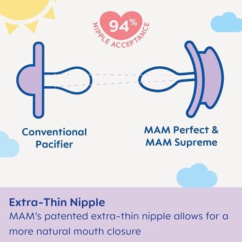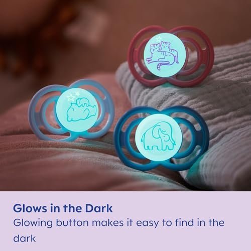 The buttons on these baby night pacifiers glow in the dark, making them easy to find at night. BPA/BPS-free MAM Night Pacifiers were developed by leading pediatric dentists and developmental psychologists to provide maximum comfort and style for babies age 0-6 months.* Our orthodontic pacifiers for breastfed babies combine technological innovation and design to help give babies a healthy start in life. The built-in air channel, naturally flattens and extends when sucked, mimicking a human nipple during breastfeeding. The symmetrical nipple fits perfectly in baby’s mouth at any angle and life-like, SkinSoft textured silicone that feels just like mom. MAM nipples are easily accepted by babies of all ages, with 94% nipple acceptance among babies tested.** Keep your baby’s pacifier clean by putting them in the microwave and storing them using the convenient MAM self-sterilizing storage case. Silicone pacifiers kept in the closed box will remain clean for up to 48 hours: Fill pacifier case with water. Place pacifier in the self-sterilizing case with the nipple facing down. Follow Pacifier package instructions for microwave setting. Cool completely before use. *Developed in conjunction with the International Children’s Medical Research Society. *Market research 2010-2020, tested with 1,572 babies