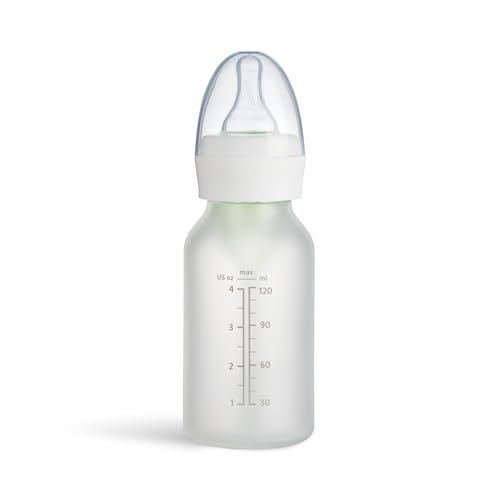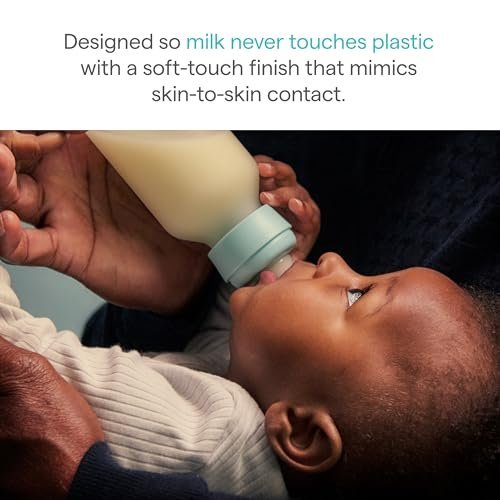 Silicone bonded glass bottle for easy, baby-approved gripping that mimics skin-to-skin contact