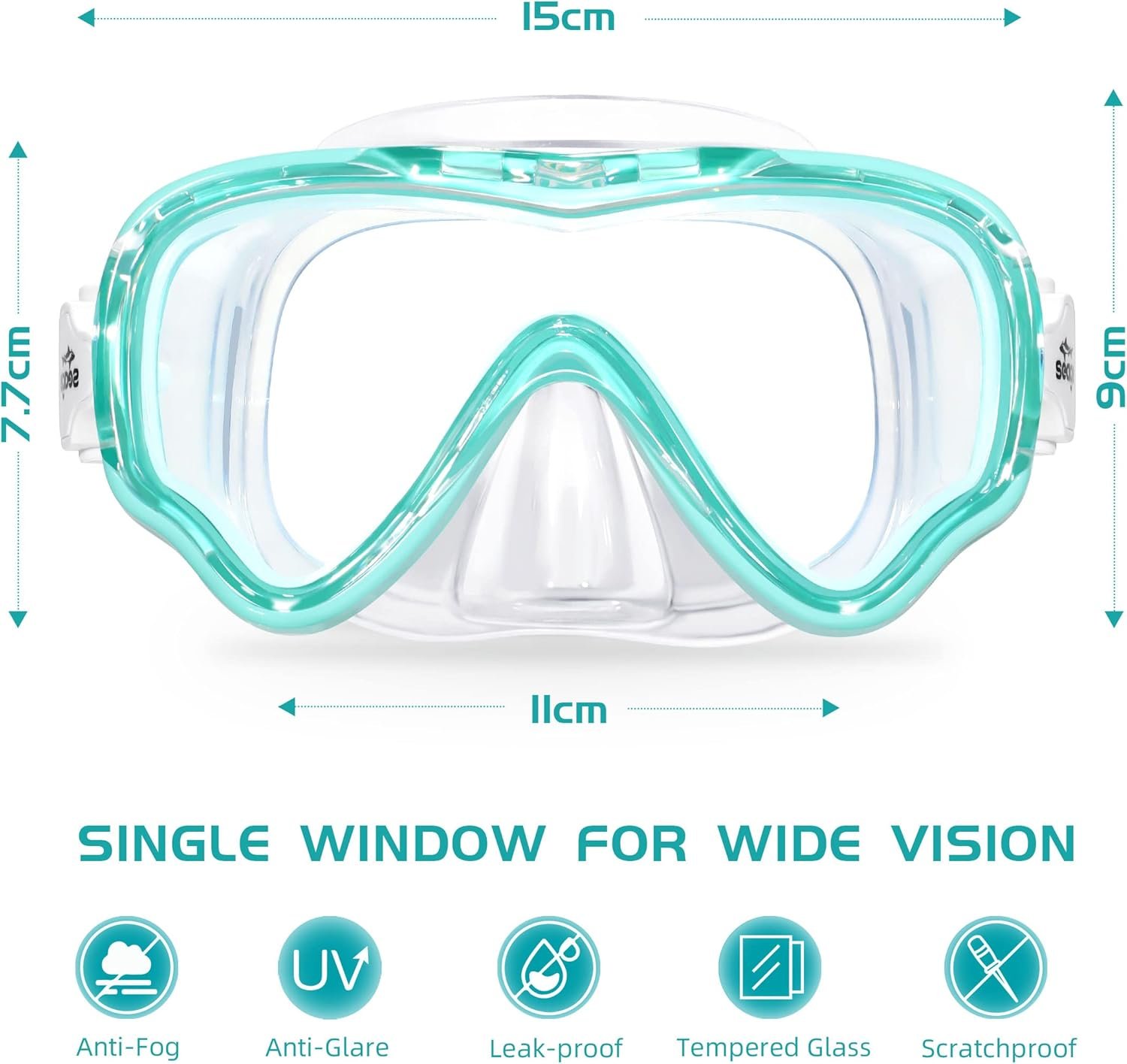 Anti-Fog Coating for Clear Viewing.Tempered Glass Lens for Non-distortion and Durability.Soft Liquid Silicone Skirt Fits a Wide Range of Face Shapes100% Leak Proof DesignSpeed Fit Buttons for Easy Headstrap Adjustment.