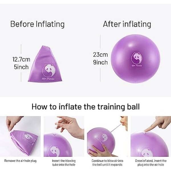 Easy to Inflate and Portable: The 9-inch Pilates ball can be easily inflated with the included tube, it can be filled with air in a few breaths, and once inflated, you just need to quickly insert the air nozzle. The mini exercise ball has a small diameter and folds up for easy portability and storage.