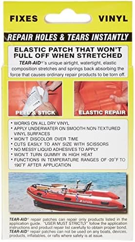 The Tear Aid Inflatable Kit Yellow Type B (Vinyl) contains a 3″ x 12″ Tear Aid Patch that cuts with scissors to any size. Also a 7/8″ x 7/8″ Patch, 1 3/8″ x 1 3/8″ Patch, 12″ reinforcement filament for repairing tears at edges and an illustrated instructions product repair list.