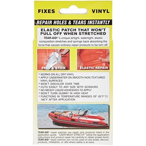 The Tear Aid Inflatable Kit Yellow Type B (Vinyl) contains a 3″ x 12″ Tear Aid Patch that cuts with scissors to any size. Also a 7/8″ x 7/8″ Patch, 1 3/8″ x 1 3/8″ Patch, 12″ reinforcement filament for repairing tears at edges and an illustrated instructions product repair list.
