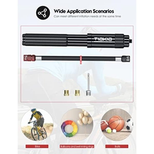 【More Valve Types】: This mini high-pressure pump is suitable for schrader, presta and donlop valve. schrader & presta double-head valve design is easy to use. Tiakia mini tire pump can inflate bicycles, electric cars, motorcycles, automobiles, sports balls and swimming rings (with a conversion donlop valve attached), and are versatile.