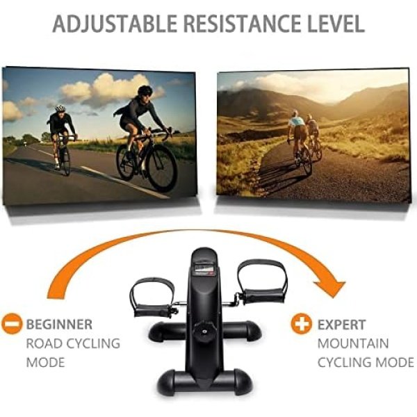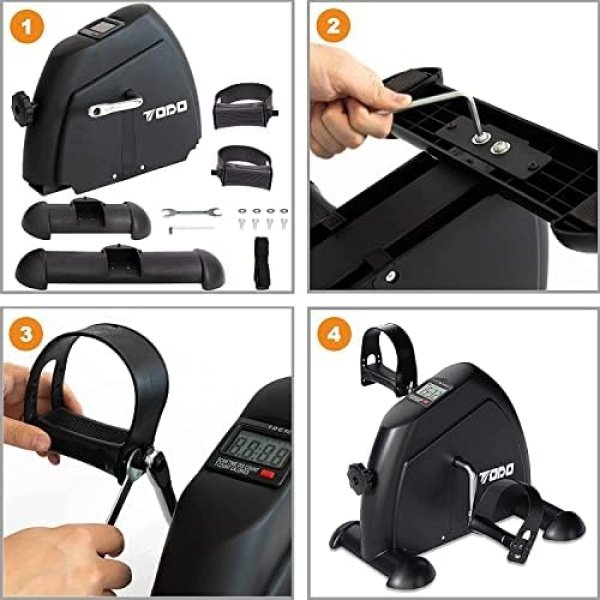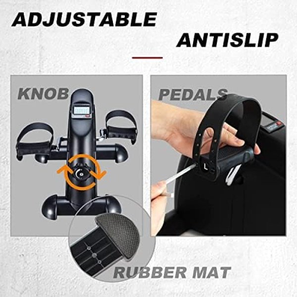 【COMPACT and PORTABLE】Compact designed makes it lightweight and portable, easily to store under desk or similar space, each pedal also has a nonslip surface with molded finger grips and adjustable toe loops for added comfort and safety. Anti-scuff rubber feet will never scratch the floor, it can be used both on floor for leg exercise and on desk for arm exercise.