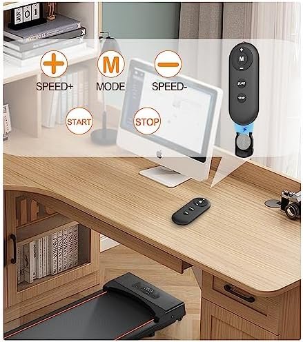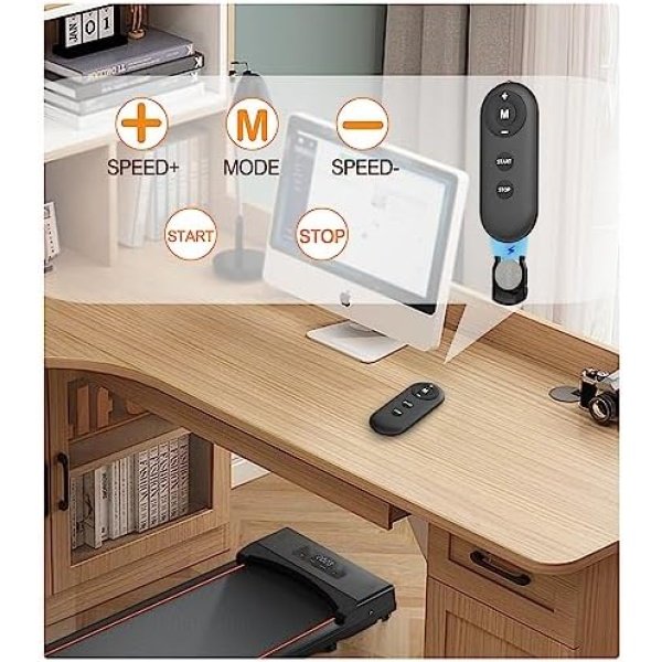 【MULTI-FUNCTION DISPLAY & REMOTE CONTROL】Desk treadmill controlled by 1VS1 version remote control. Press the button to Start/Stop, Increase/Decrease, and the display will switch Speed, Time, Distance and Calorie automatically. You can also press the Manual button to set a perfect Time or Distance countdown for yourself.
