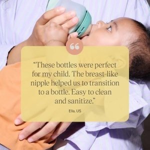 So, it’s our award-winning breast-like nipple that you and baby love, but now you can combine it with our most breast-like bottle. When you are looking for a bottle that is the next best thing to you, this is the one! Made from soft-feel silicone that allows the warmth of the milk to be felt by baby and the softness that feels like a breast so your baby will be comforted when you are not an option. Loved by moms and babies, our easy latch-on, breast-like nipple feels closer to skin and mimics the natural flex and movement of a mom’s breast for a comfortable feeding. 95% of moms reported that their baby accepted the super soft silicone nipple with skin-like feel and would recommend to others. All Closer to Nature bottle nipples feature an anti-colic valve to prevent the symptoms of colic by ensuring your little one ingests more milk and less air. Together with the bottle’s sensitive valve, the wide bottle neck encourages your baby’s intuitive feeding action. Designed to be held in the most natural position during feeding, the compact shape of the bottle also allows baby to be closer to you. The anti-static silicone coating keeps the bottle clean and hygienic by repelling dust particles and won’t retain any stains and odors left behind by breast milk or formula. The wide neck bottle makes cleaning easy, and the bottles are suitable for use in the dishwasher, microwave, sterilizer and bottle warmer. Easy to assemble and guaranteed no leaks when feeding your baby with an included lid and travel disc to prevent spills or leaks when on the go. 100% BPA, PVC and Phthalate free for your ultimate reassurance. Our Soft Feel Silicone Bottles are only compatible with our range of Closer to Nature nipples – available in a range of flow rates to keep up with your growing baby. We recommend changing your bottle nipples every two months or if they get damaged, weak or bitten by tiny teeth.