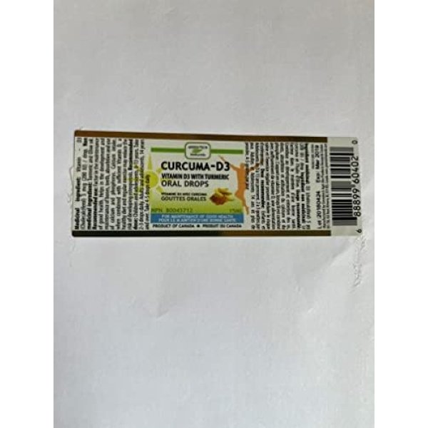 *VITAMIN D3 ORAL DROPS WITH TURMERIC NPN 80043712, A unique synergistic formulation that keeps you in GOOD HEALTH. Vitamin D is derived from sunlight and deficiency of this vitamin can affect your mood, bone strength, immunity and overall health. The right amount of sunshine can lift your mood. Turmeric is another golden spice of life with many benefits known since ancient times. While vitamin D and Curcumin ( found in Turmeric) have ample health benefits in their own right, research has revealed that the two when combined has a great synergistic effect and can do wonders in maintaining overall health. Greentech Agri-Bio Product Research Centre has done extensive study of research done on these two potent ingredients and came up with this new idea of formulation of Curcuma D3 providing the health benefits of both Vitamin-D3 and Turmeric. Moreover all adults, adolescents and children can use Curcuma- D3 oral drops. Take recommended dose (s) of these vital drops every day or swallow with any non alcoholic liquid of your choice and remain active and healthy. No artificial flavor, no artificial color and no preservative. 100% natural. INGREDIENTS:Vitamin D3( Cholecalciferol) 5 mcg (200IU)/Drop,Turmeric (Curcumin) and Pure Olive oil RECOMMENDED DOSE(S): Children and Adolescents: 0-13 years 2-3 drops daily Adults and Adolescents: 14 years and over 4-5 drops daily RECOMMENDED USE: Factors in the maintenance of good health. Helps in the development and maintenance of bones, teeth, absorption and use of Calcium and Phosphorus. Calcium intake, when combined with sufficient Vitamin D, a healthy diet and regular exercise may reduce the risk of developing Osteoporosis.