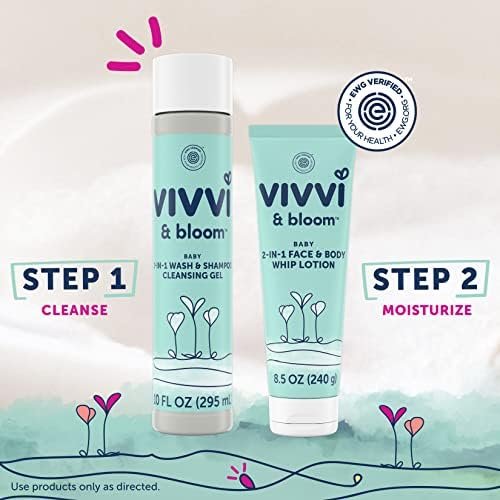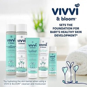 Gently moisturize baby’s delicate skin for 48 hours with Vivvi & Bloom 2-in-1 Baby Face & Body Whip Lotion. Clinically tested on sensitive skin, this whipped lotion provides long-lasting hydration for baby’s developing skin. With its 96% natural origin formula,* including responsibly sourced shea butter, lotion has a non-sticky formula that melts into skin for easy application & has a naturally derived scent** & contains a natural origin** prebiotic to help support skin’s natural lipid production & make it more resilient. The EWG Verified lotion has a formula to hydrate skin & 92% of parents agree that baby’s skin felt healthier after the first use. Pediatrician- & dermatologist- tested lotion is hypoallergenic, pH-balanced, vegan & not tested on animals & is formulated without parabens, phthalates, phenoxyethanol, dyes, gluten, silicones & essential oils. *As per ISO 16128-1:2016 based on cumulative volume including water. **Naturally derived ingredients as per ISO 16128-1:2016.
