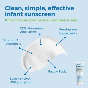 Baby Sunblock – 6 edible-grade ingredients: non-nano zinc oxide, water, olive oil, beeswax, vitamin E, vitamin D. We only use superior ingredients in this baby organics sunscreen. NO gluten, soy, dairy or nuts. Tear-free, cruelty-free, hypoallergenic.
