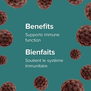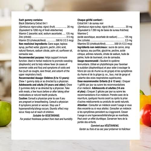 Antioxidant and Immune Support: Each gummy contains 20 mg of Black Elderberry Extract (equivalent to 1,280 mg of fresh elderberries), 500 IU of Vitamin D3, 125 mg of Vitamin C and 2.5 mg of Zinc