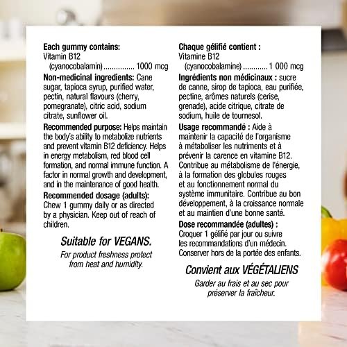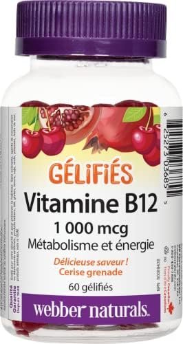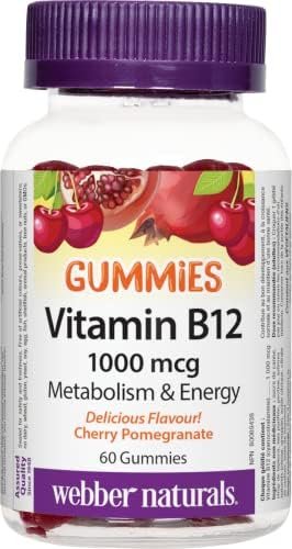 Vitamin B12 from Webber Naturals is a one-per-day, delicious gummy providing 1000 mcg of vitamin B12. These cherry-pomegranate-flavoured gummies support energy metabolism, red blood cell formation, and normal immune function, as well as help prevent vitamin B12 deficiency.
