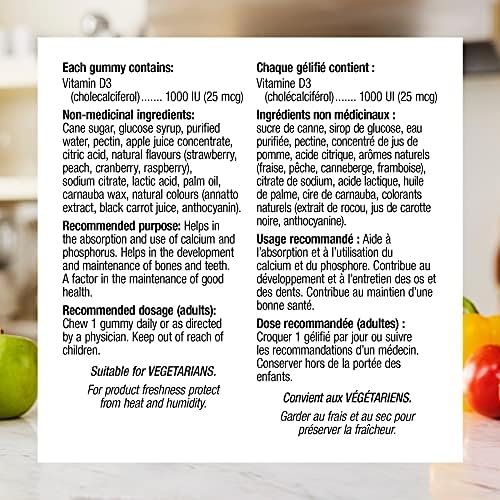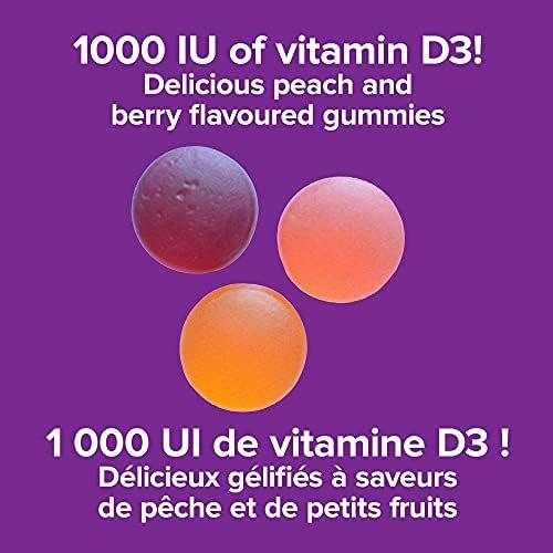 Vitamin D3 Gummies from Webber Naturals offers a convenient and delicious way to get this vital nutrient. Each natural mixed berry and peach-flavoured gummy provides 1000 IU of vitamin D3 for the maintenance of good health. This nutrient is essential for calcium and phosphorous absorption, and the development and maintenance of bones and teeth.